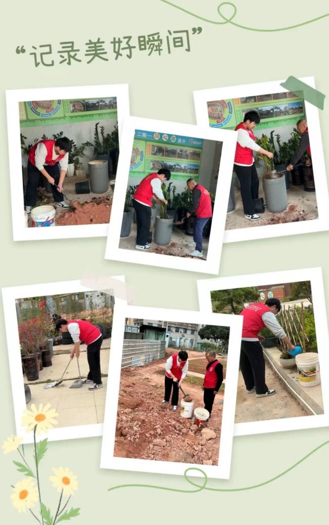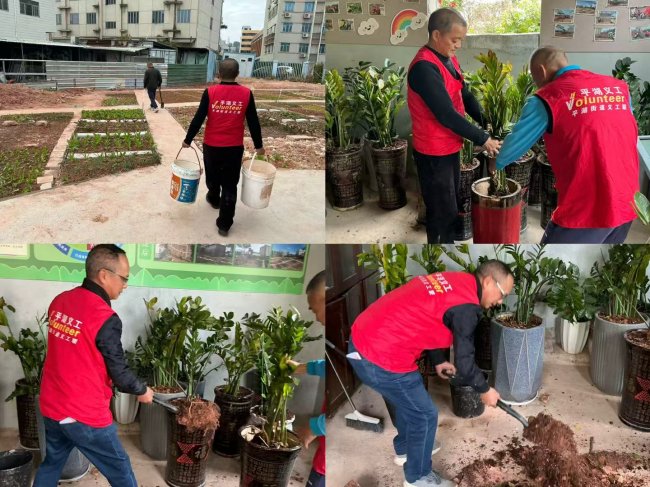 同行的义工也各司其职、默契配合:有的专注于花苗移栽,仔细将绿植从旧盆中取出、整理根系,再小心植入新盆;有的提着水桶往返于水源与菜圃之间,为土壤补充养分;还有的在公共区域清理垃圾,共同维护着禾睦蔬院二期的整洁与生机。大家分工协作,让志愿服务高效又温暖。