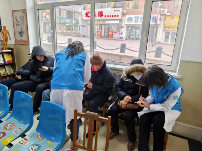 图2:实践团成员为社区居民记录数据 连理医心实践团 供图