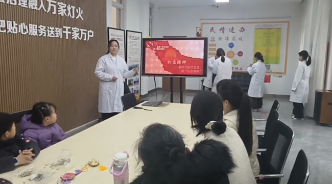 走出红色场馆,践行初心使命。团队成员将红色学习成果转化为实际行动,深入社区开展“红医精神”主题宣讲与中医药健康科普志愿服务活动,让红医温暖与中医药智慧走进群众身边。活动现场,成员们身着白大褂,化身“红医传承人”与“健康守护者”,结合自身中医药专业特色,向社区居民尤其是青少年群体,生动讲述红医先辈们的感人故事,深入解读“红医精神”在新时代的丰富内涵与时代价值,引导群众传承红色基因、弘扬红医精神。