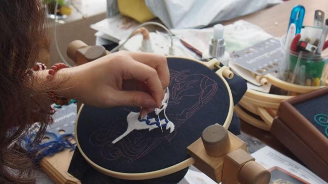 访谈环节,团队成员与鲁绣非遗传承人黄涛展开深入交流,围绕鲁绣行业的发展现状展开细致咨询与全面梳理,同时深入了解了企业的发展历程与背后的创业故事。据黄涛介绍,他受家庭熏陶初识鲁绣,早年深耕电商领域,借国家非遗扶持政策契机返乡创业,将电商经验与传统技艺融合。30年间,其创办的企业已培养36名专业手艺人,带动200余名社区居民灵活就业,让非遗技艺成为乡村致富纽带。