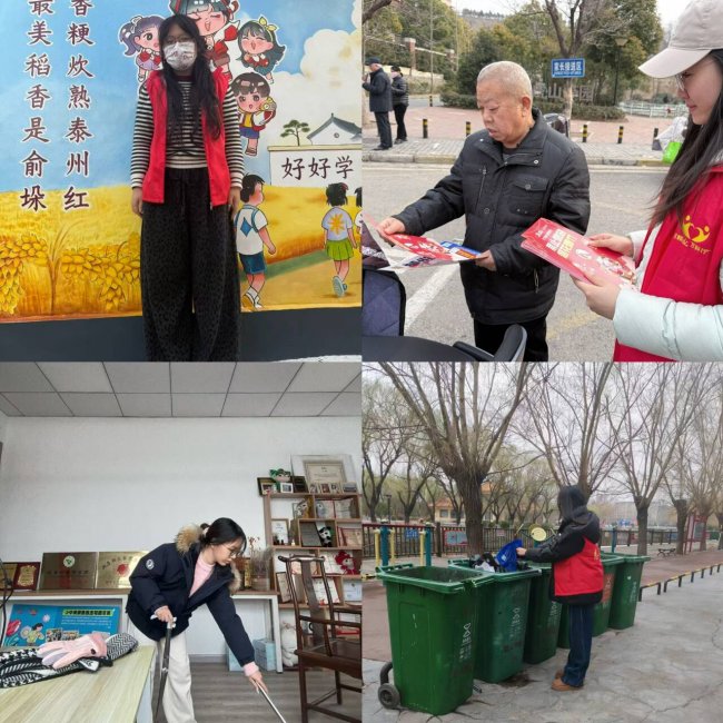 在乡村振兴一线,队员王安琪与村干部一同走村入户,为独居老人、困难家庭送去春联、米面油等慰问品,并帮助老人打扫庭院、张贴春联,手把手教他们使用智能手机视频通话、查询政策,帮助跨越数字鸿沟。她还参与村容村貌整治,清理道路两旁垃圾、规整杂物,并粉刷彩绘墙壁共筑文化工程,向村民宣传安全用火用电、防范电信诈骗、医保社保等知识。
