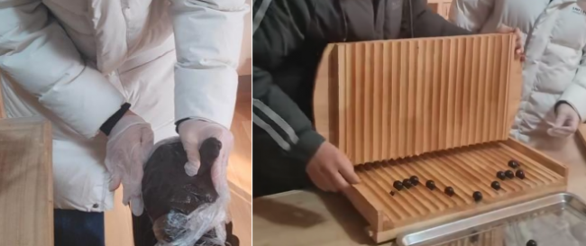 将大块药坨分割后,在特制的搓丸板或手工搓制下,制成粗细均匀的长条,再分切成定量的小块,最后搓制成表面光滑、圆整、重量一致的球形丸粒。老师演示了手工搓丸的巧劲与手法,指出这是体现工匠手感的关键步骤。