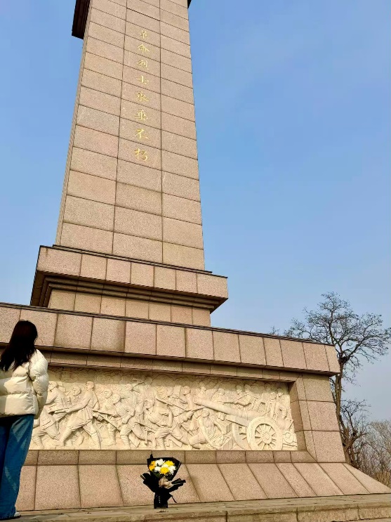 步入陵园,高耸的“革命烈士永垂不朽”纪念碑赫然矗立眼前,令人肃然起敬。碑身巍峨,底座四面镌刻着抗战题材的石刻浮雕,再现了当年邹县军民英勇斗争的壮烈场景。纪念碑旁,摆放着前来瞻仰者敬献的鲜花,寄托着后人对英烈的无限哀思。实践队员在碑前肃立默哀,深切缅怀为革命献身的英雄们。