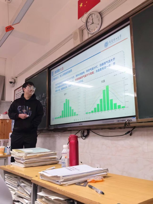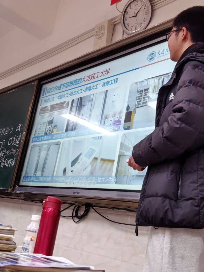 队伍提前和学校、班主任对接时间安排,于当晚九点进入班级宣讲。宣讲围绕大连理工大学的地理环境、办学条件、学生体验开展。队伍首先分发宣传单,并介绍了大学所在的城市大连和盘锦校区所在的盘锦市,展示当地宜人的生活环境和便利的交通。