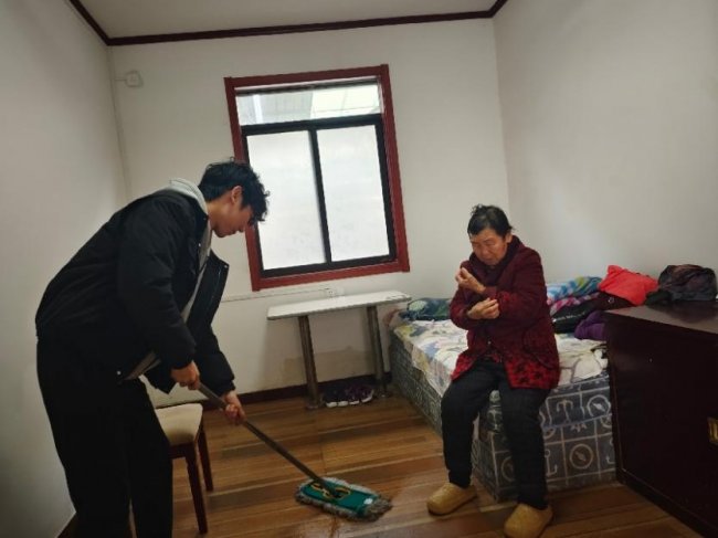 相较于打扫,他更看重“陪伴”。在张奶奶房间,他耐心倾听老人回忆年轻时手扎灯笼的趣事;见李爷爷想收拾子女送来的新年礼物却不便弯腰,他立即上前协助整理。“我就是您的‘临时孙子’,这些事让我来。”朴实的话语让老人笑逐颜开。片刻的闲聊与举手之劳,让清冷的房间充满了笑声。