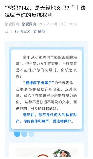 为使法治教育效果持续深化,团队充分利用了其运营的“聚爱同舟”公众号平台发布了专题文章,如《父母打我是天经地义吗?法律赋予你反抗的权利》等,将线下活动的即时影响力转化为线上可长期获取的普法资源,形成了“线下宣讲点燃关注,线上内容巩固知识”的联动模式,有效拓展了活动的覆盖面与持续性。