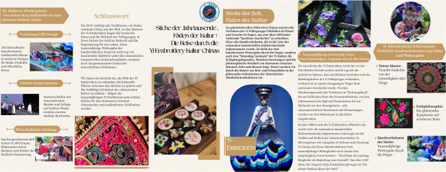 为保障线下宣传效果、让彝绣文化更好地被德国民众接受,团队提前做好充分筹备,不仅专门编制了彝绣德语宣传册,精准译介彝绣核心知识与技艺,还精心挑选、整理彝绣实物展品,直观呈现彝绣的针脚特色与纹样美感。宣传册与实物相互配合,成为此次线下宣传的核心载体,为后续多场景宣传活动顺利开展奠定基础。
