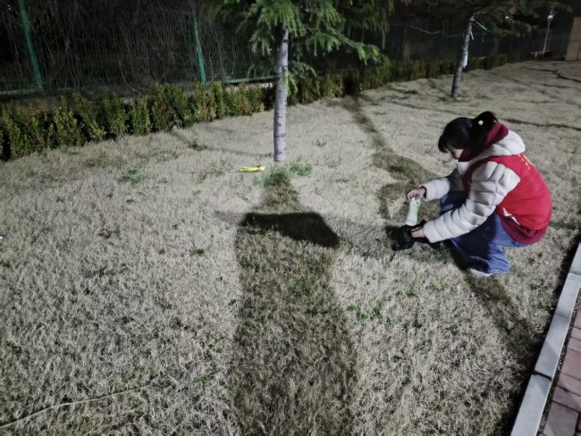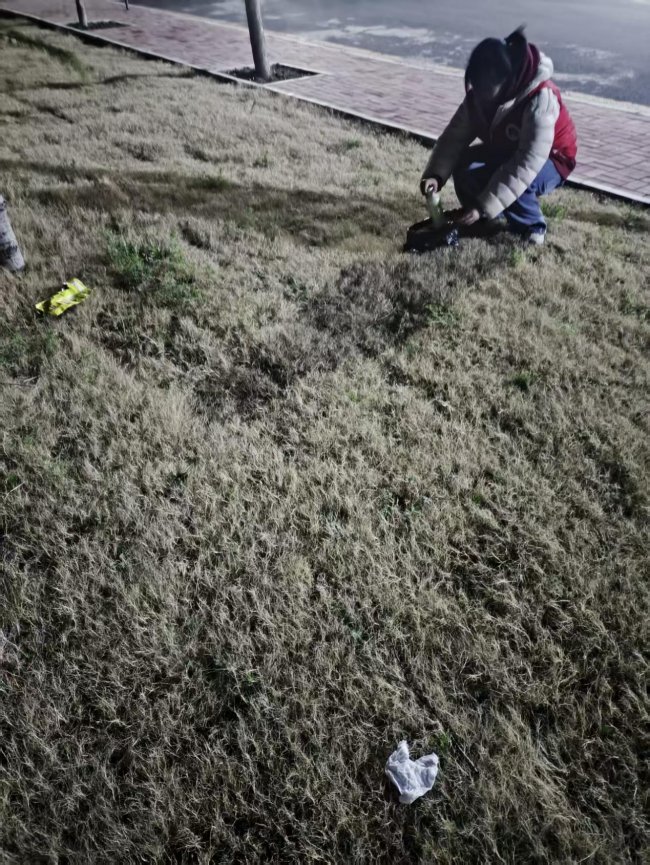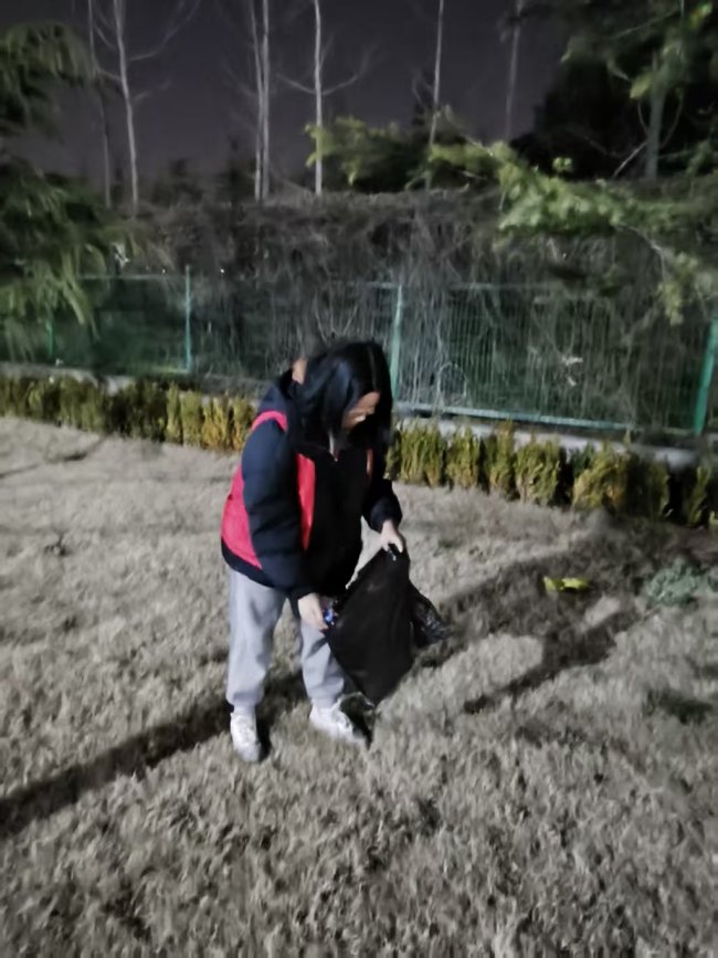 夜幕下,他们手持垃圾袋,仔细清理草坪上的塑料瓶、包装袋等垃圾,不放过任何一处卫生死角。