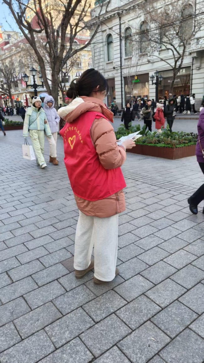 在哈尔滨街头,志愿者们化身“振兴使者”,向市民与游客分发宣传资料,推荐家乡特色美食与文旅资源,耐心讲解家乡发展成果,引导大家关注本土产业、支持家乡建设。