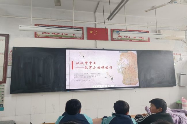 队友们先是通过PPT演讲介绍了甲骨文的起源并带领同学们认识到简单的甲骨文。当屏幕上出现一个甲骨文“日”字——圆圈中间一点,孩子们齐声惊呼:“像太阳!”“对,古人就是看着天上的太阳画出了这个字。”接着,“月”字弯弯如钩,“山”字三峰并立,“水”字潺潺流动。孩子们瞪大眼睛,仿佛第一次发现,原来汉字可以这么有趣。