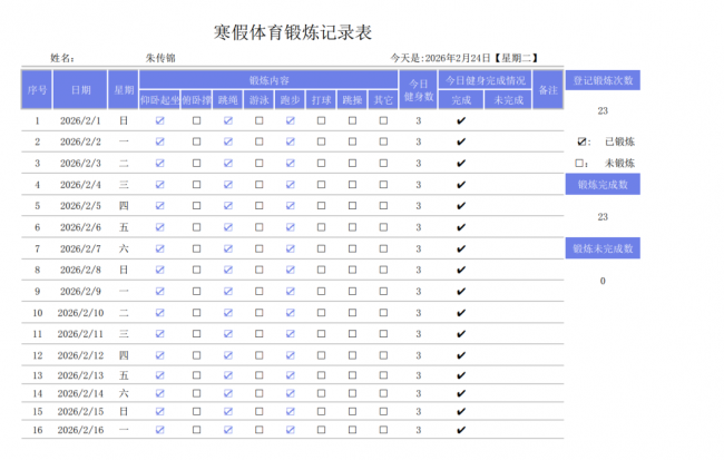 图 1 寒假锻炼表