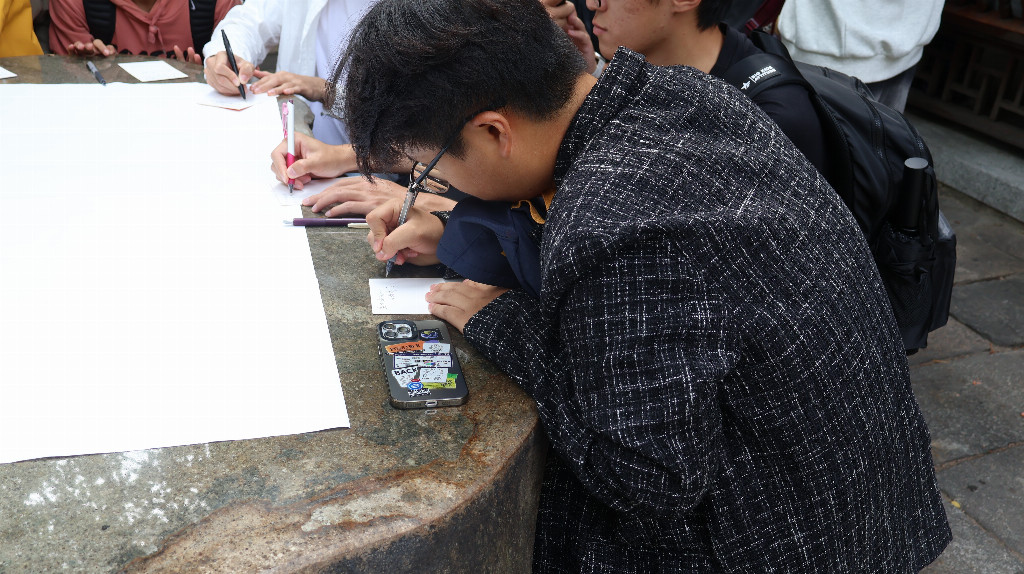 活动尾声,大家围坐品读历史细节,有人专注书写感悟,笔尖落下“如果信仰有颜色,那一定是中国红”的坚定有人围坐石桌共绘红色印记,相机定格下思想碰撞的瞬间;更有支部成员在传统文化氛围中互动,认真书写的侧脸、热烈讨论的笑脸、凝视文物的目光,都是青春与历史对话的生动注脚。此次参观活动作为历史回溯与精神接力的契机,通过品读细节、书写感悟、共绘印记及传统文化互动等形式,展现了支部青年以青春对话历史的生动实践,彰显了红色精神传承与家国情怀赓续的时代内涵。未来,他们将继续以行动践行初心使命,让革命信仰与传统文化在新时代绽放更加璀璨的光芒。