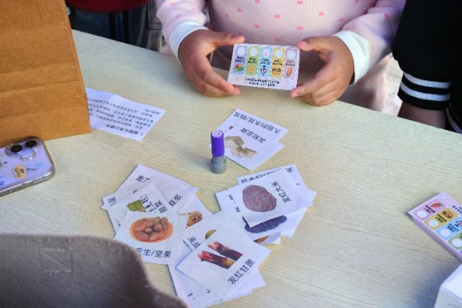 “安全标识套圈乐”摊位前更是充满了欢声笑语,成为集市里的热门打卡点。地面上摆放着一排套筒杯,杯身贴着QS标志、绿色食品、有机食品、三无产品等常见食品标识贴纸,参与者站在1.5米外进行套圈,套中后说出标识含义就能盖章。“套中啦!”小朋友们欢呼着扔出套圈,套中后认真思考标识的意义,“绿色食品是安全的,是健康的食物!”“三无产品没有生产日期,不能买!”大家你一言我一语,在瞄准、投掷的欢乐过程中,牢牢记住了食品包装上的基础安全标识,也建立起了正确的食品购买意识,学会了买东西时先看标识的小窍门。