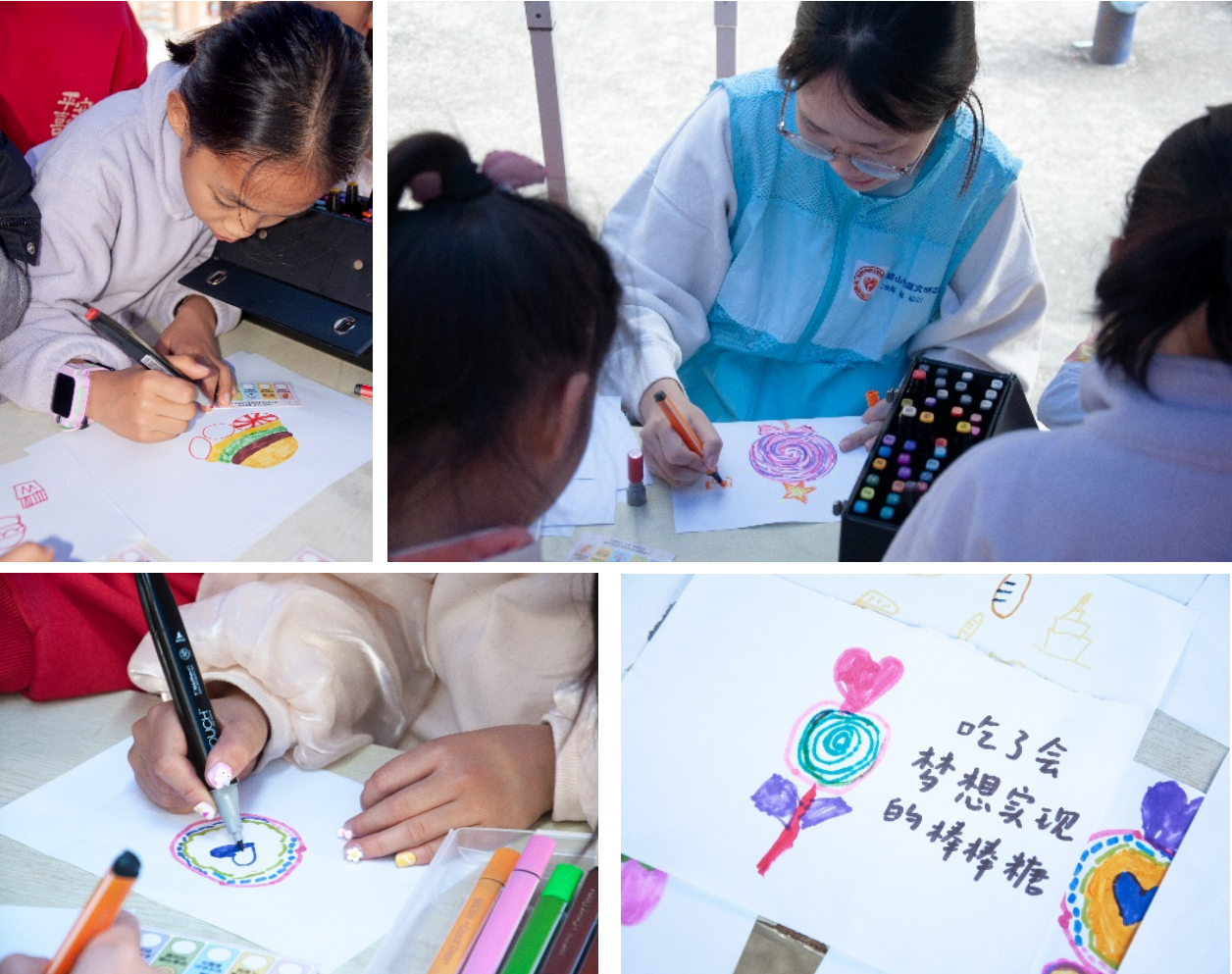 图为(小朋友专注绘制创意美食作品、实践队员指导小朋友创作趣味糖果画、小朋友细致勾勒作品的装饰纹样、小朋友的作品:“吃了会梦想实现的棒棒糖”)