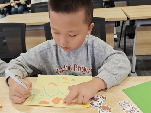 随着轻柔的音乐如涓涓细流般响起,孩子们闭上眼睛,静静倾听。在那片属于自己的想象天地里,旋律化作色彩,节奏凝成形状。他们拿起画笔,将心中浮现的“音乐画面”轻轻铺展在纸上——有的绘出夏夜星空下起伏的深蓝海浪,有的勾勒出晨光微露时藏着小鹿的静谧森林。每一笔都沾染着童年的想象,每一抹色彩都诉说着未被说出的感动。在分享时光里,孩子们像诉说秘密一样,轻声讲述画中的故事。那些简单而真挚的语言,悄然触动了在场每个人的心。
