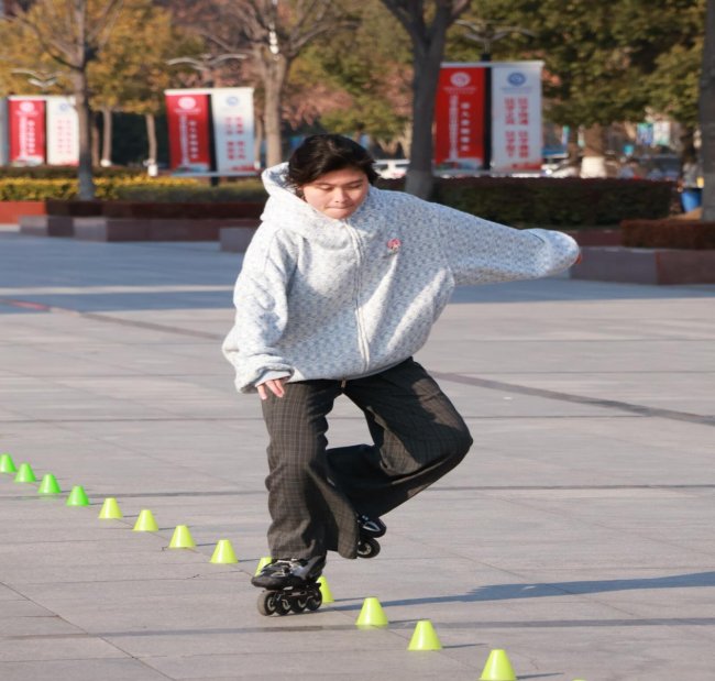 活动以趣味竞技与技术交流为核心,设置了轮滑版贴膏药、象鼻转平衡赛、百桩挑战赛等多个特色项目。赛场上,同学们化身“追风少年”,在桩阵间灵活穿梭,在协作游戏中默契配合,炫酷的技巧与欢快的笑声交织,充分展现了轮滑运动的魅力。自由表演环节中,成员们的自编动作更是赢得阵阵喝彩。