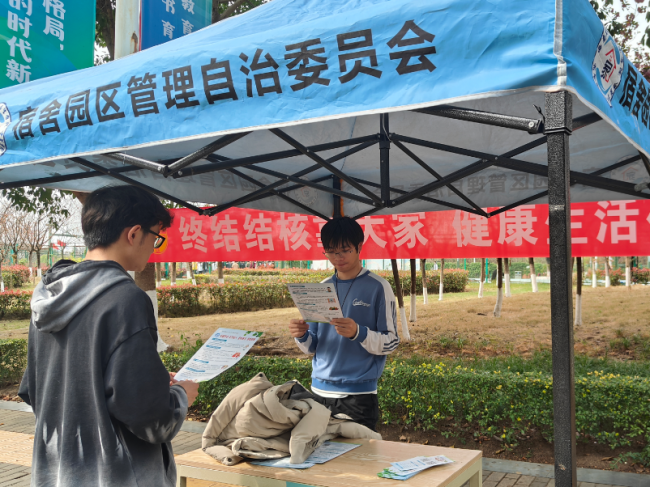 “千里之堤,溃于蚁穴。”校园健康防线同样需要从细微之处筑牢。为使宣传真正深入学生群体,宿舍园区管理自治委员会充分发挥学生组织力量,组建“防核宣讲团”,开展进宿舍、面对面宣讲活动。宣讲团采用“敲门入户”方式,利用晚间查寝时间走进学生宿舍,携带宣传折页开展宣讲。内容围绕结核病的传播途径、典型症状、宿舍通风技巧、发现疑似病例的应对方式以及国家免费检查和治疗政策等方面展开,语言简洁易懂,讲解细致入微。宣讲过程中,学生骨干还现场指导同学们如何科学开窗通风,帮助大家养成良好的卫生习惯。“一屋不扫,何以扫天下?”宿舍虽小,却是健康生活的第一阵地,守住这一方空间,便是守护自身与同伴的健康。
