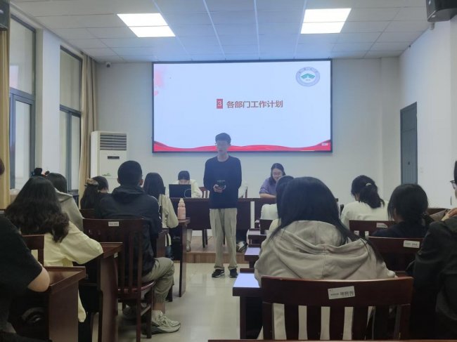第三项议程聚焦部门工作规划,宣传部、学术部、文体部、实践部、综合事务部部长依次上台,清晰阐述部门职能与学期计划:宣传部明确活动摄影、海报制作等宣传职责;学术部规划学术研讨会、经验分享会等活动;文体部聚焦文体活动筹备;实践部强调每月与社区联动的工作目标;综合事务部说明物资管理与集体活动资料统计的具体要求。同时,结合十月时间节点,会议明确提出“加快活动策划推进节奏、确保活动内容阳光正确与格式工整美观”的工作要求,为后续工作划定标准。
